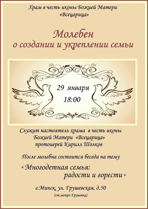 29 января 2017 года в 18.00 в храме в честь иконы Божией Матери “Всецарица” состоится Молебен о создании и укреплении семьи. Взяв свое начало чуть более года назад – 31.12.2015, Молебен стал важным и всегда с нетерпением ожидаемым богослужением в храме. После молитв, в которых собравшиеся просят Господа о семейном благополучии, проводятся встречи с интереснейшими людьми. Тема предстоящей беседы: “Многодетная семья: радости и горести”.
