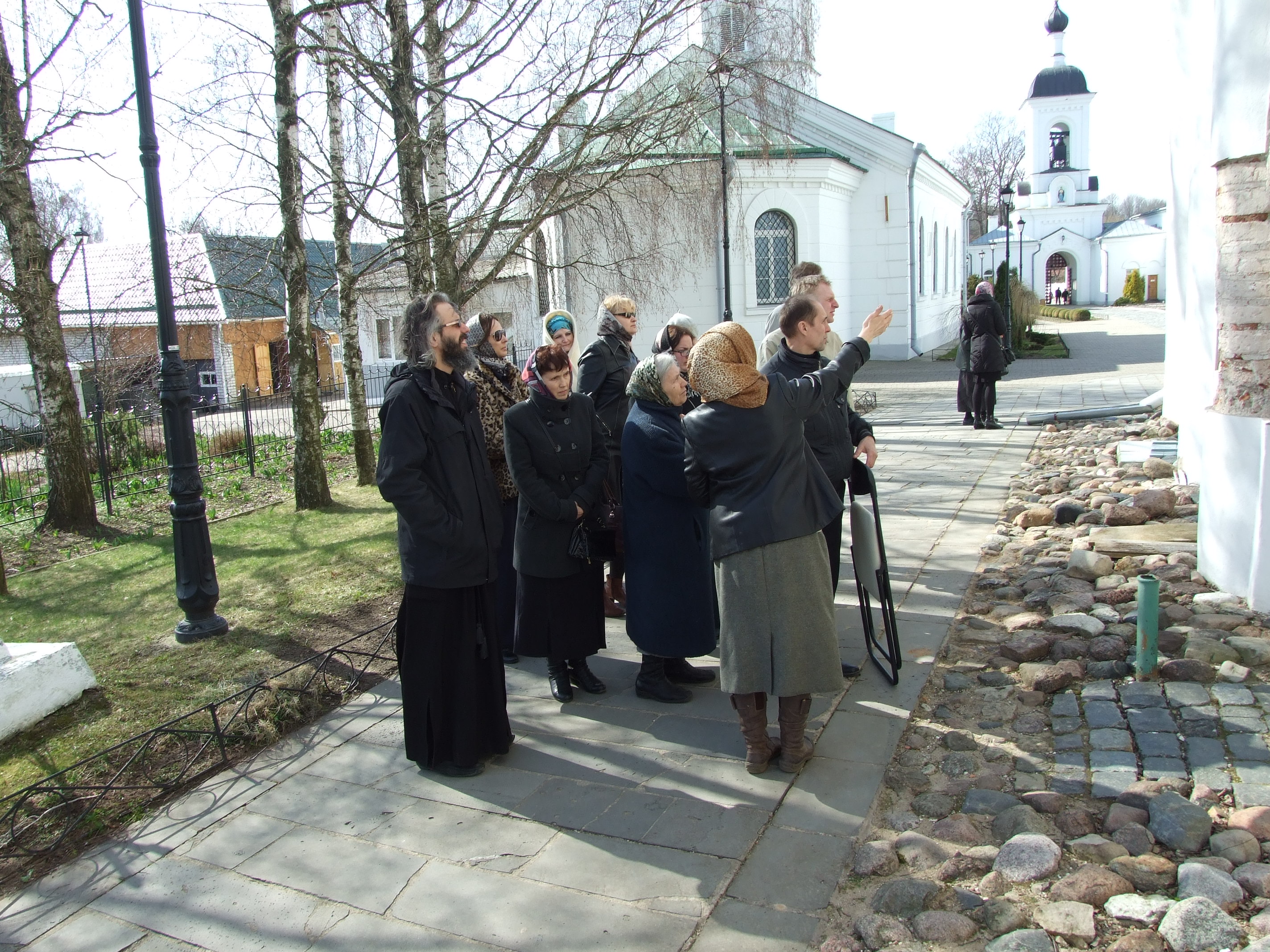 После литургии была проведена интересная экскурсия, в ходе которой удалось посетить жемчужину монастыря – Спасо-Преображенскую церковь с уникальными фресками XII века. Одной из самых драгоценных святынь монастыря является знаменитый Крест Евфросинии Полоцкой, созданный в 1161 году мастером-ювелиром Лазарем Богшей (крест пропал во время войны, сейчас в монастыре храниться его копия). Крест считается важнейшим символом христианства, который выражает высшие сакральные ценности: восхождение духа, стремление к Богу, вечности, является моделью бытия и человека в нем. По благословению Владыки Феодосия паломникам удалось приложиться к Кресту, подняться в келью Ефросинии Полоцкой, проползти под дубовой резной ракой с Веригами. Сестры монастыря говорят, что люди, с верой поклоняющиеся веригам, получают исцеление душевных и телесных недугов.