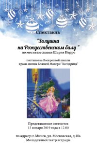 К светлому празднику Рождества Христова преподаватели и ученики Воскресной школы храма иконы Божией Матери “Всецарица” поставили спектакль “Золушка на Рождественском балу” по мотивам сказки Шарля Перро! Представление состоится 13 января в 12.00 в Молодежном театре эстрады (ул. Московская, 18а). Давайте поделимся друг с другом рождественской радостью! Ждем всех желающих! Вход свободный!