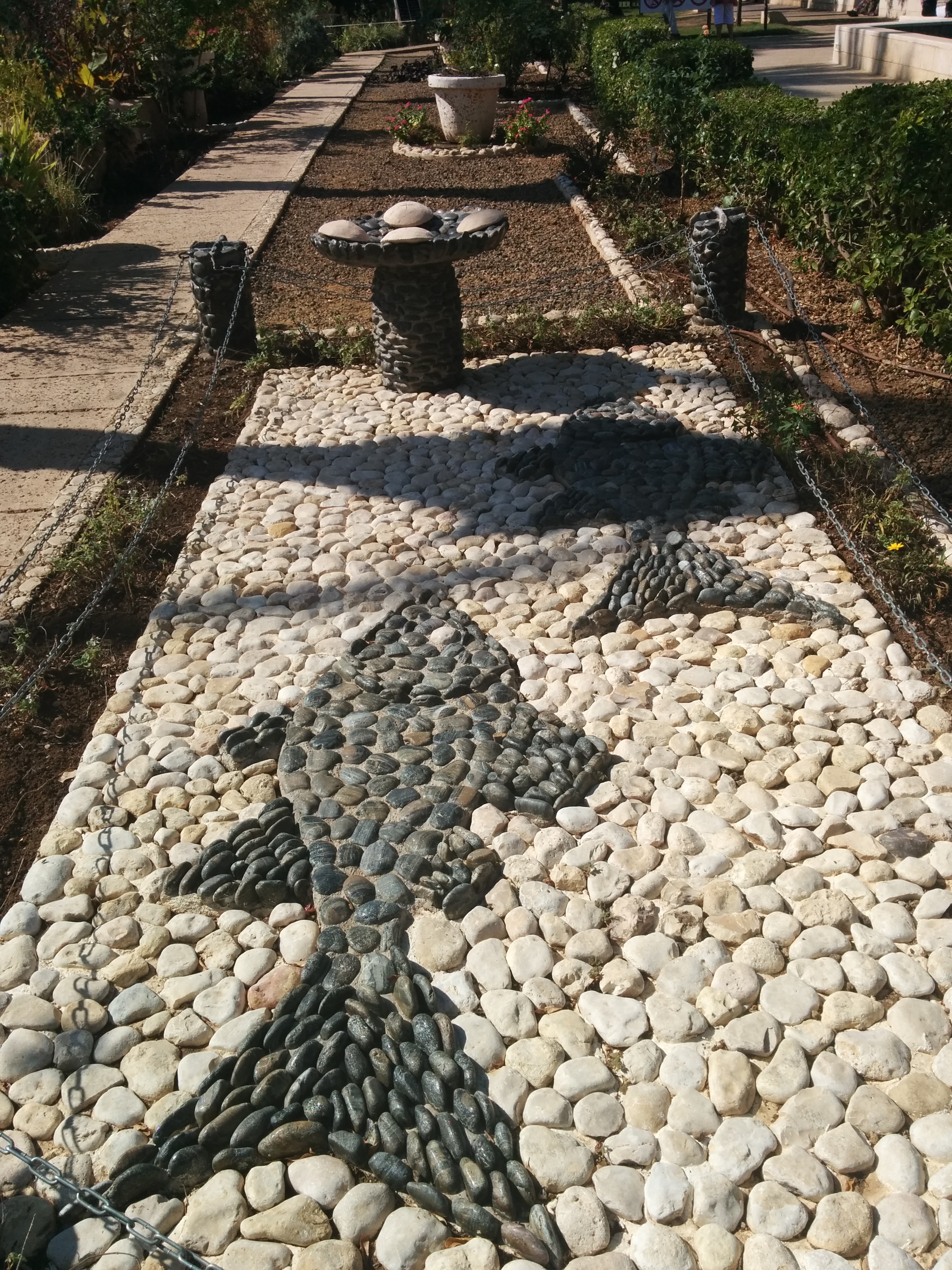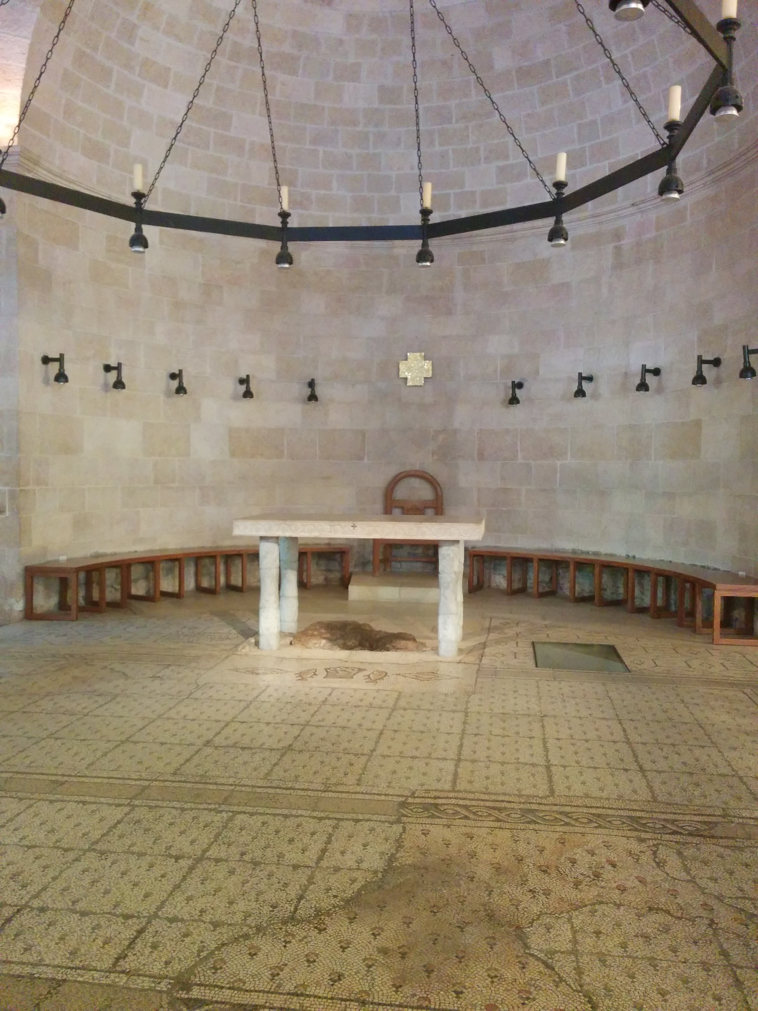 Следующим местом посещения стала г. Блаженство (место Нагорной Проповеди Спасителя) и место Умножения 5 хлебов и 2 рыб. В память явления Спасителя по Воскресении, когда апостолы, занятые безуспешной ловлей, на берегу заметили Учителя, не смея верить, что это Он, и чудесного улова по Его слову, и последующей трапезы на берегу, когда апостол Петр был восстановлен в своем служении,- бенедиктинский орден воздвиг по близости небольшой монастырь, а у самой воды на базальтовых камнях малый храм-часовню во имя святого апостала Петра. На ближайшем холме состоялась нагорная проповедь Спасителя, в честь чего католиками там построен монастырь, в котором принимают паломников. Близ самого моря стоит небольшой храм с галереей и видом на море, посвященный “Заповедям блаженства”. Возле моря на месте где стоял Спаситель паломники прочитали Евангелие от Матфея и еще раз вспомнили Заповеди блаженства. Настоятель прихода о. Кирилл (Шолков) сказал проповедь, объяснив, что означает “блаженство” и как мы должны стремится к его обретению.