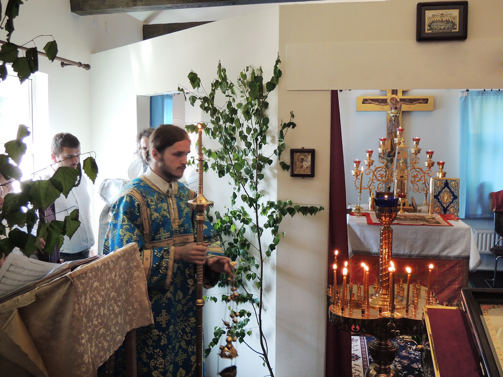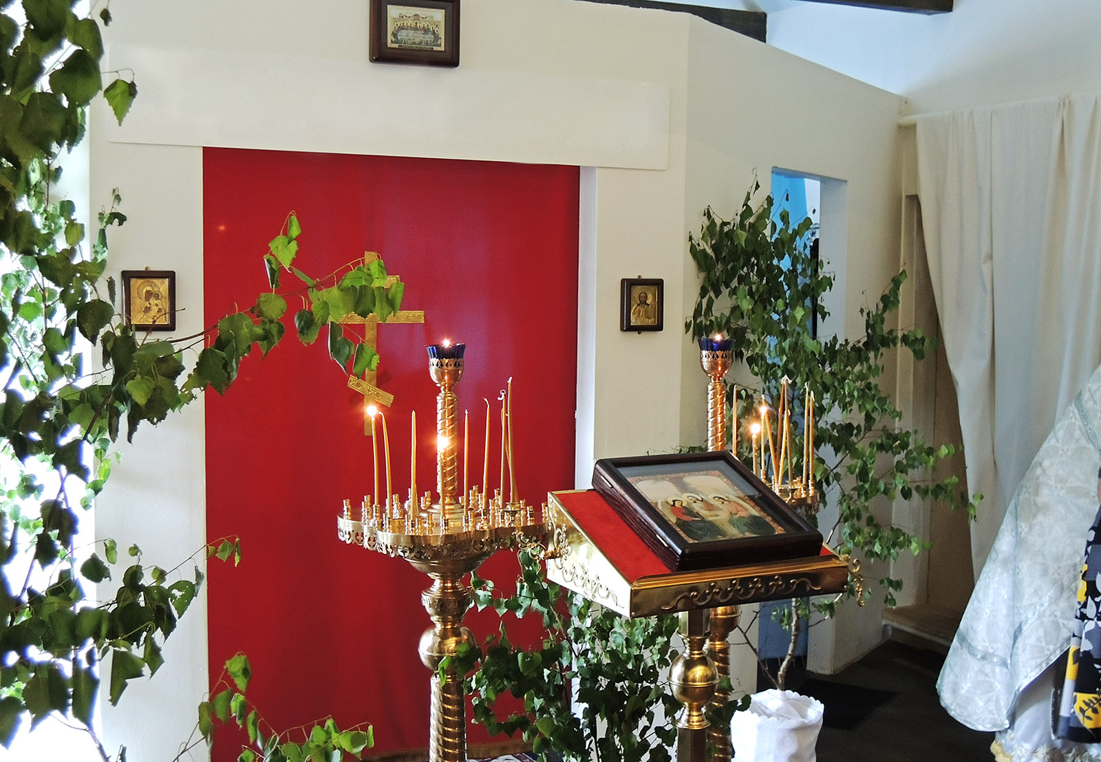Согласно традиции храм был украшен цветами и ветками березы. Эта традиция уходит своими корнями в далекое прошлое и напоминает нам священную Мамврийскую дубраву, где по библейскому преданию патриарха Авраама посетил Триединый Бог под видом трех странников.