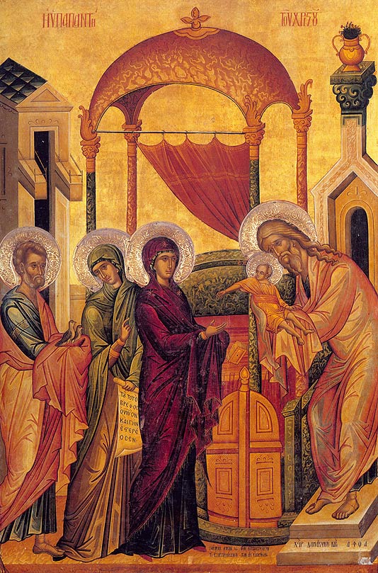 Богоприимец Симеон взял Богомладенца на руки, и, благословив Его, пророчествовал о Спасителе: «Ныне отпущаеши раба Твоего, Владыко, по глаголу Твоему с миром: яко видеста очи мои спасение Твое, еже еси уготовал пред лицем всех людей: свет во откровение языком, и славу людей Твоих Израиля».