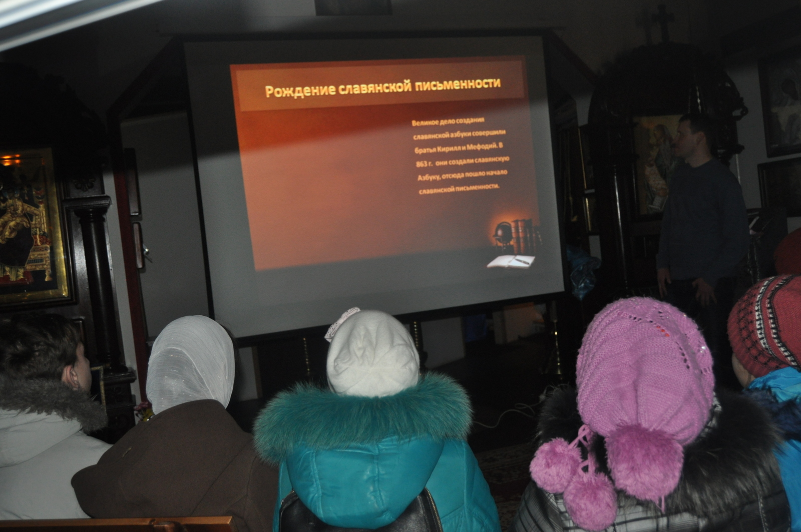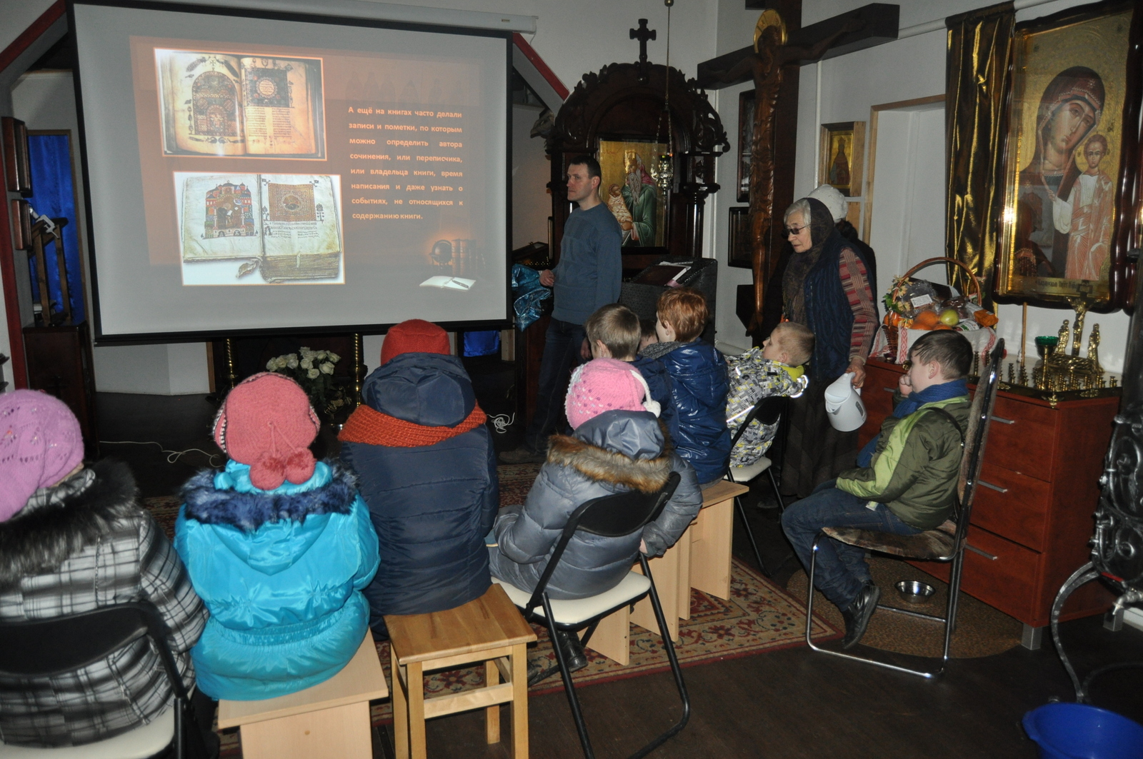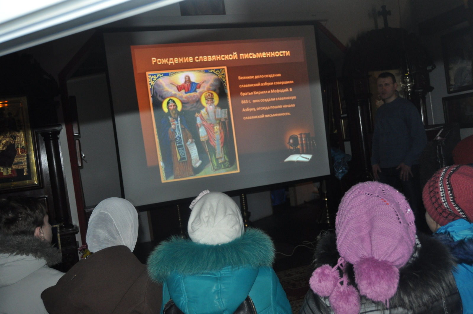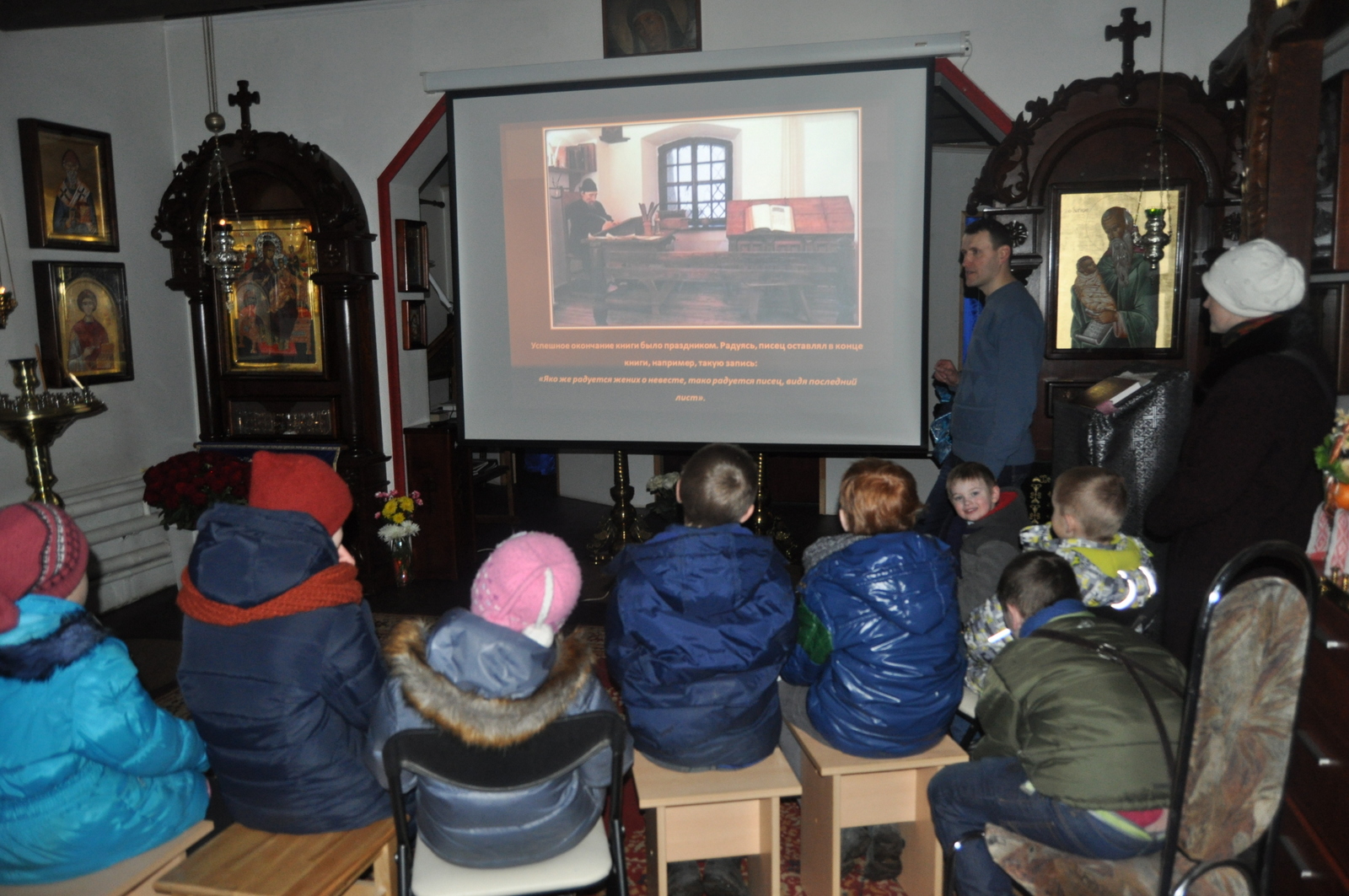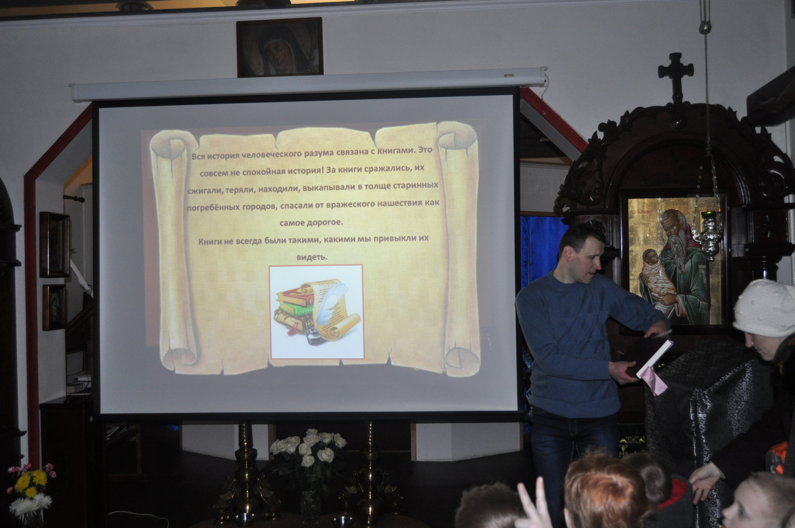 В этом году празднование Дня православной книги совпало с последним днем масленицы – Прощенным воскресением. После Божественной Литургии учащиеся воскресной школы вместе с родителями и преподавателями по участвовали в мастер-классе по изготовлению блинов. После сытной трапезы, детей ждала познавательная викторина на тему письменности и православной книги. Задание были выстроены таким образом, чтобы дети повторили Недели Великого Поста, а так же узнали о развитии письменности на белорусской земле. Финальным заданием для учащихся стал поиск книги «Апостол» в храмовой библиотеки. Настоятель храма иконы Божией Матери “Всецарица” протоиерей Кирилл Шолков подарил воспитанникам воскресной школы экземпляр «Апостол» для изучения на занятиях. После викторины учащиеся посмотрели презентацию на тему “Рождение славянской письменности”. Дети поделились рассказами о православных книгах, которые находятся у них в домашних библиотеках. Домой каждый ребенок ушел с календарем Великого Поста.