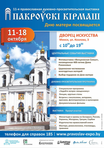 Православная духовно-просветительская выставка-ярмарка “Пакроускi кiрмаш” является официальным общецерковным мероприятием, которое проводится по решению Синода Белорусской Православной Церкви. Выставка состоится 11-18 октября 2014 г. по адресу: г. Минск, ул. Козлова, 3, Дворец искусства. Приглашаем посетить стенд храма иконы Божией Матери “Всецарица”, расположенный на 2 этаже, №98. График работы 11-17 октября с 10.00 – 19.00, 18 октября с 10.00 – 15.00